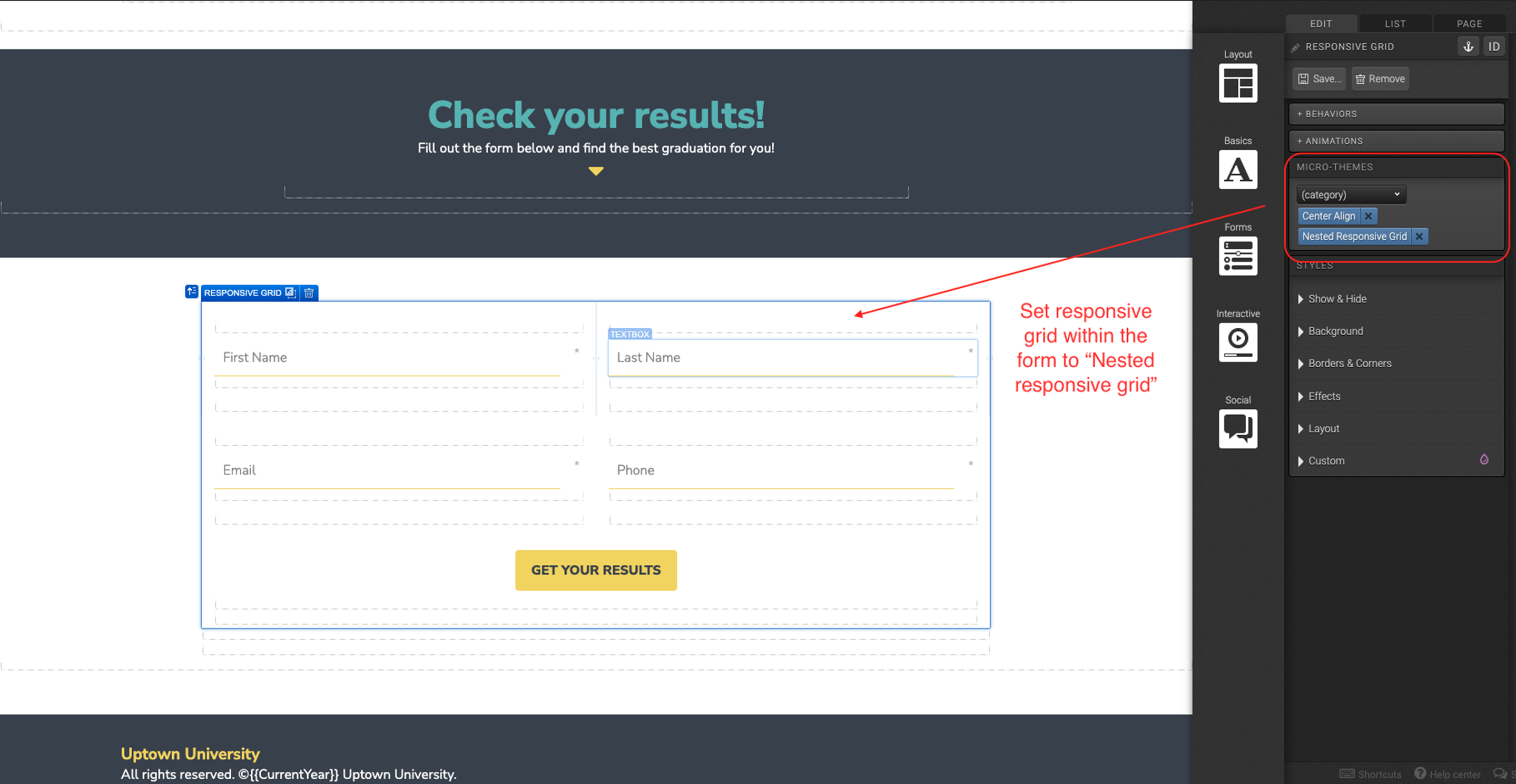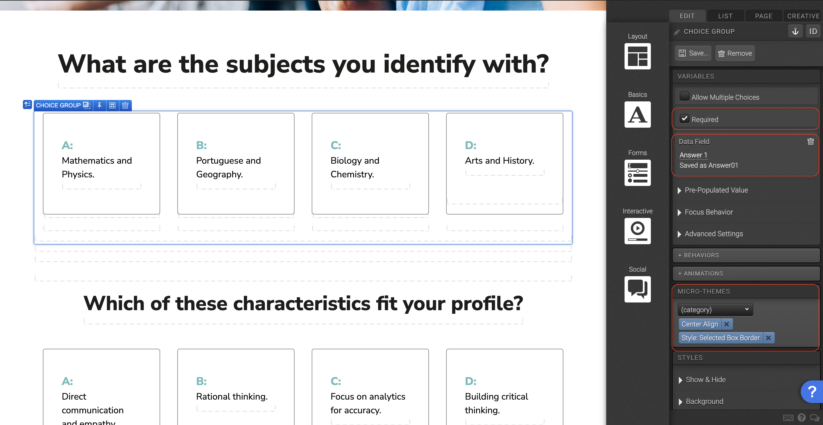 On the choice group level navigate to the Variables panel and check mark “Required”. Don’t forget to set the data field here. In the “Micro-Themes”, set the alignment to “Center Align” and in the choice group category, set the style to “Style: Selected Box Border”.