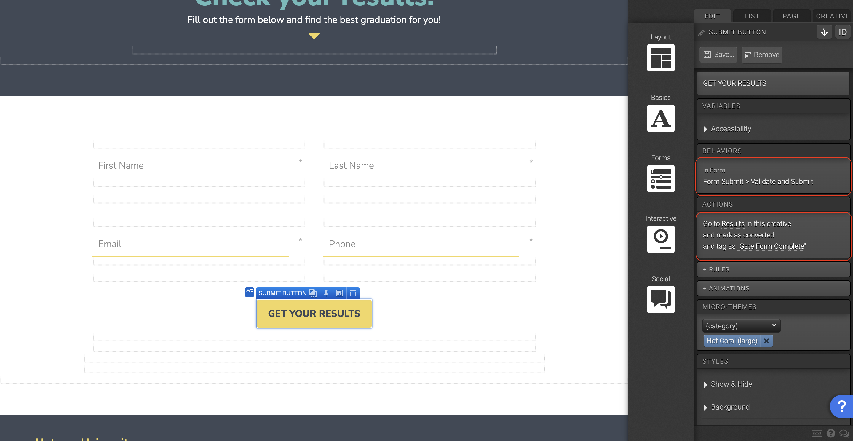 With the submit button selected, set the “Behaviors in form” to validate and submit, and set the action to the next page the user is supposed to see after completing the form. *You can also set the submit button to be “marked as converted”. Many people will use a form for the purpose of gathering information and tracking.