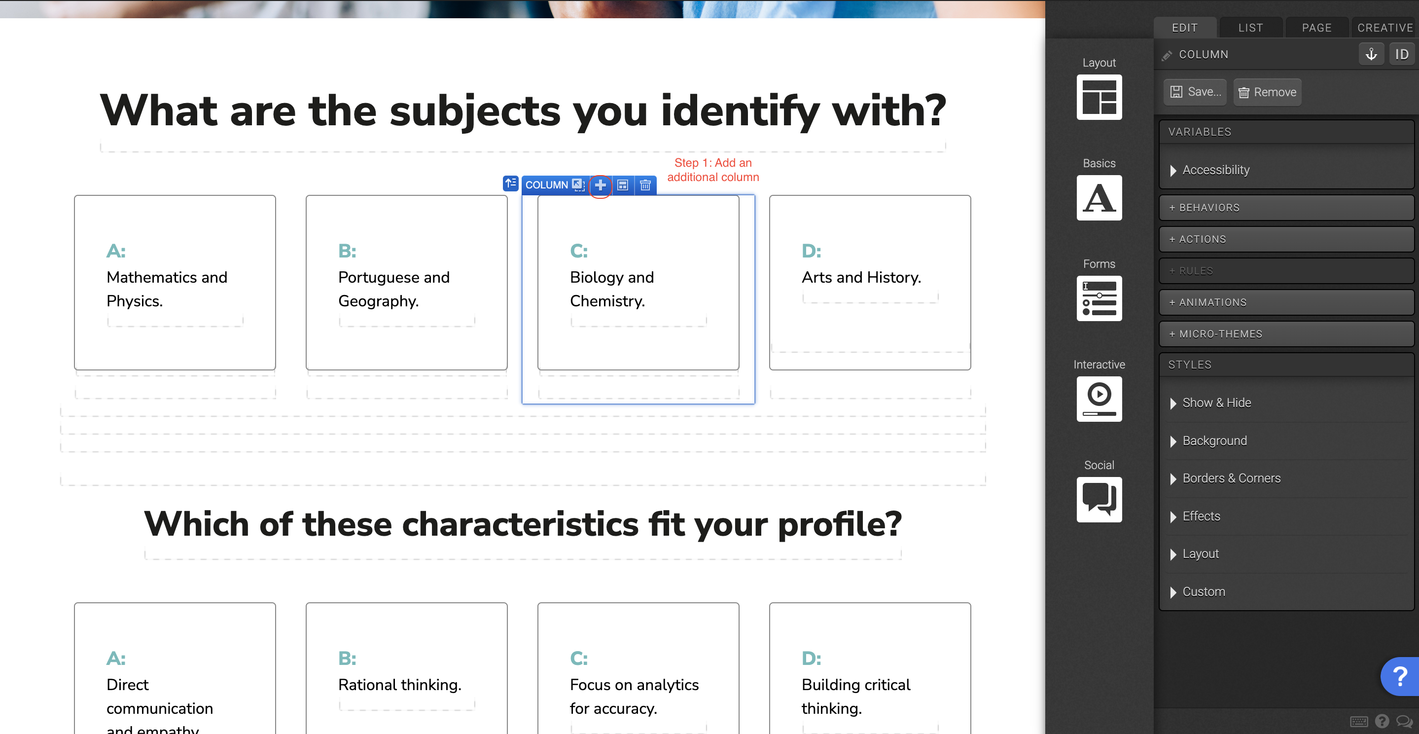 Add an additional column to the responsive grid within the choice group. Change the row settings so that all columns have the same width. Here you can also change the row setting for different viewports, to make the assessment responsive in multiple screen sizes.