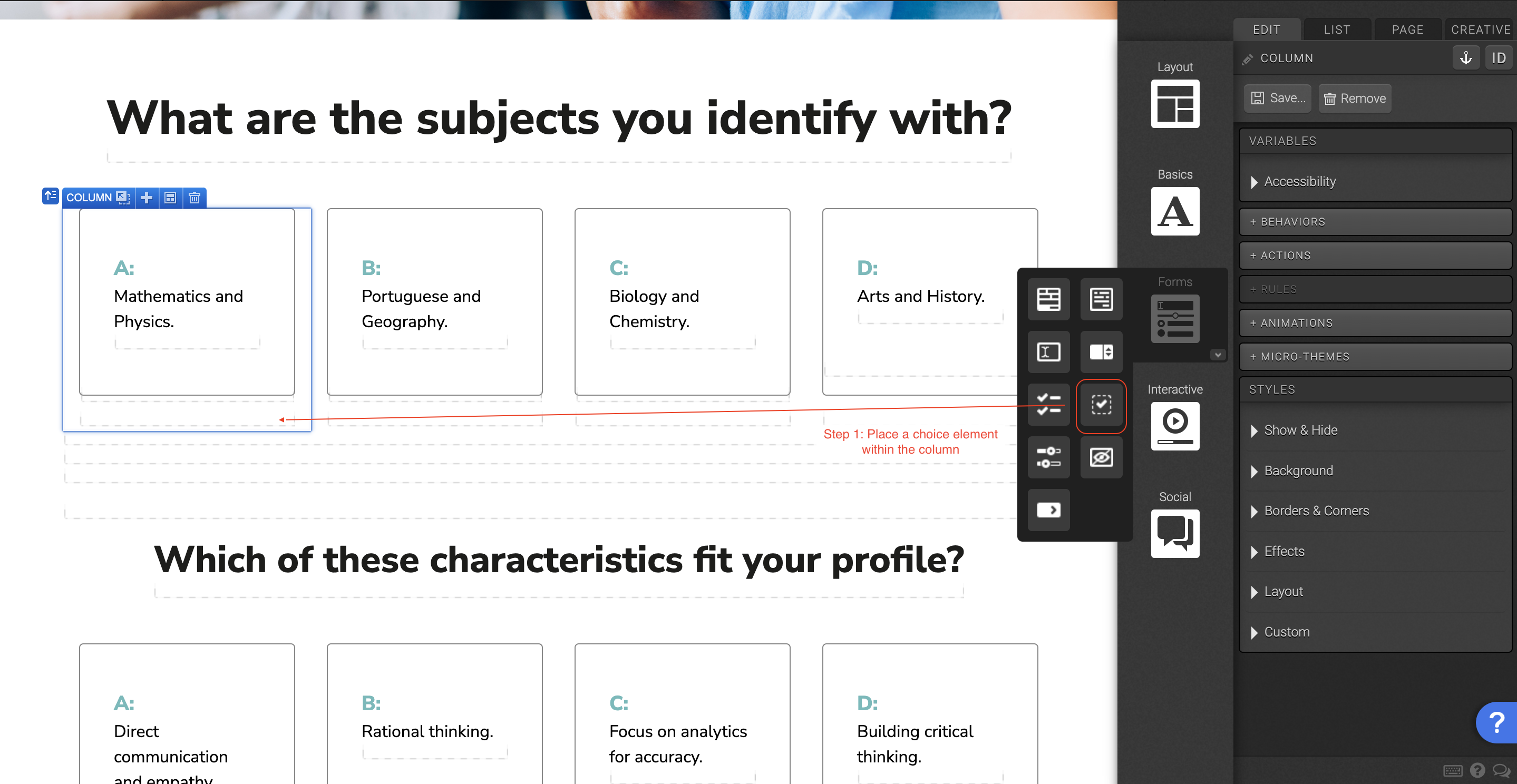 Place a “Choice” element within each column. In the Variables panel give the choice a “Data Value”, and set the Default Selection to “Unselected”. In the Behaviors panel, set the “Behaviors in Flow” to move to next, and the “Behaviors in Form” to validate and submit. In the Layout panel add 15px bottom margin, and 25px left and right padding.
