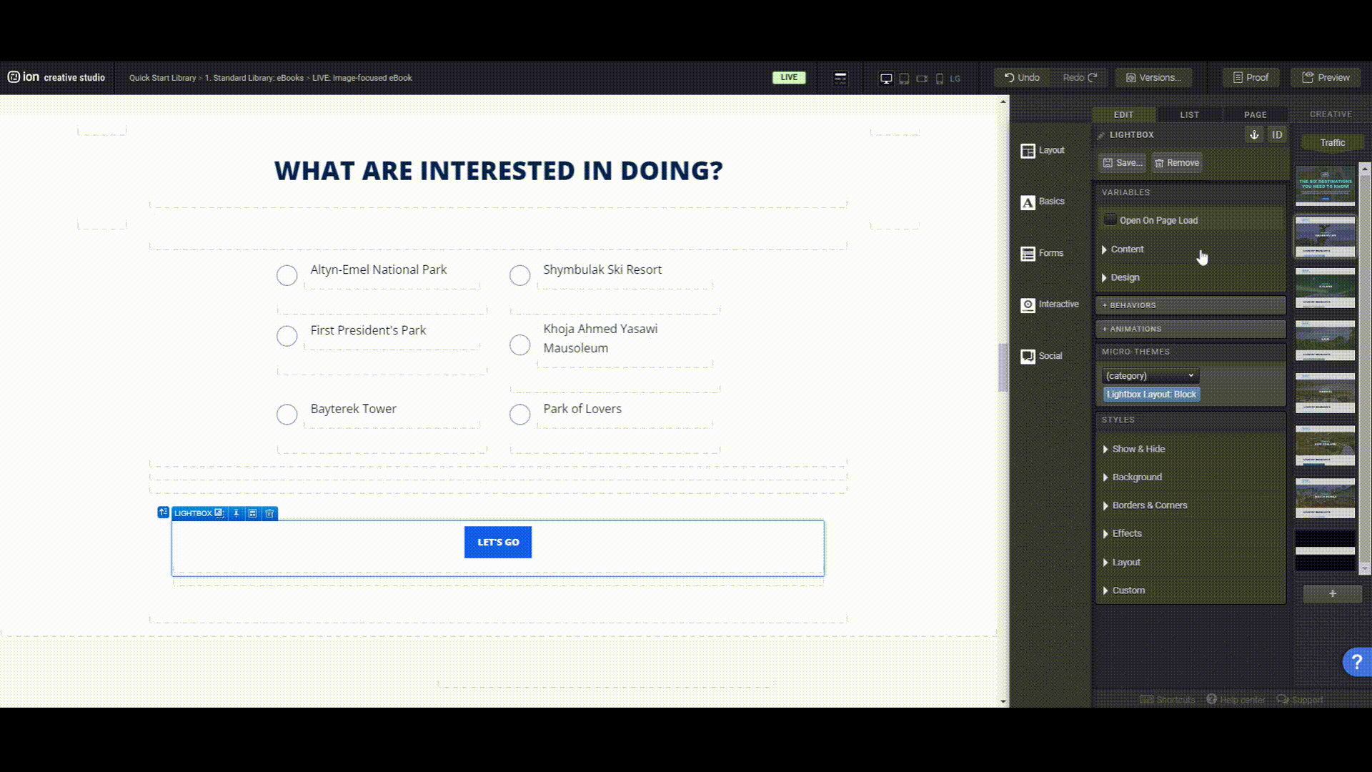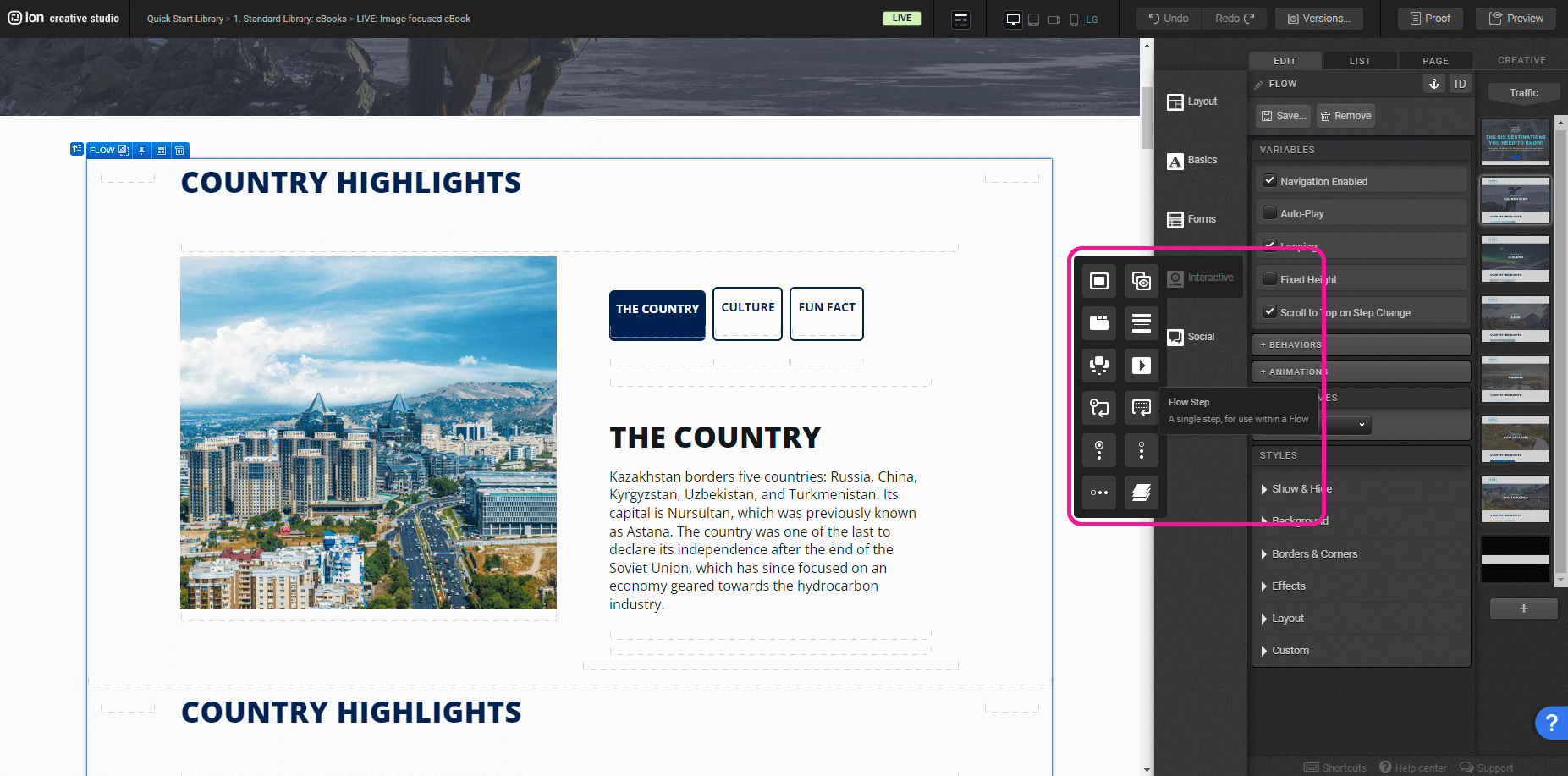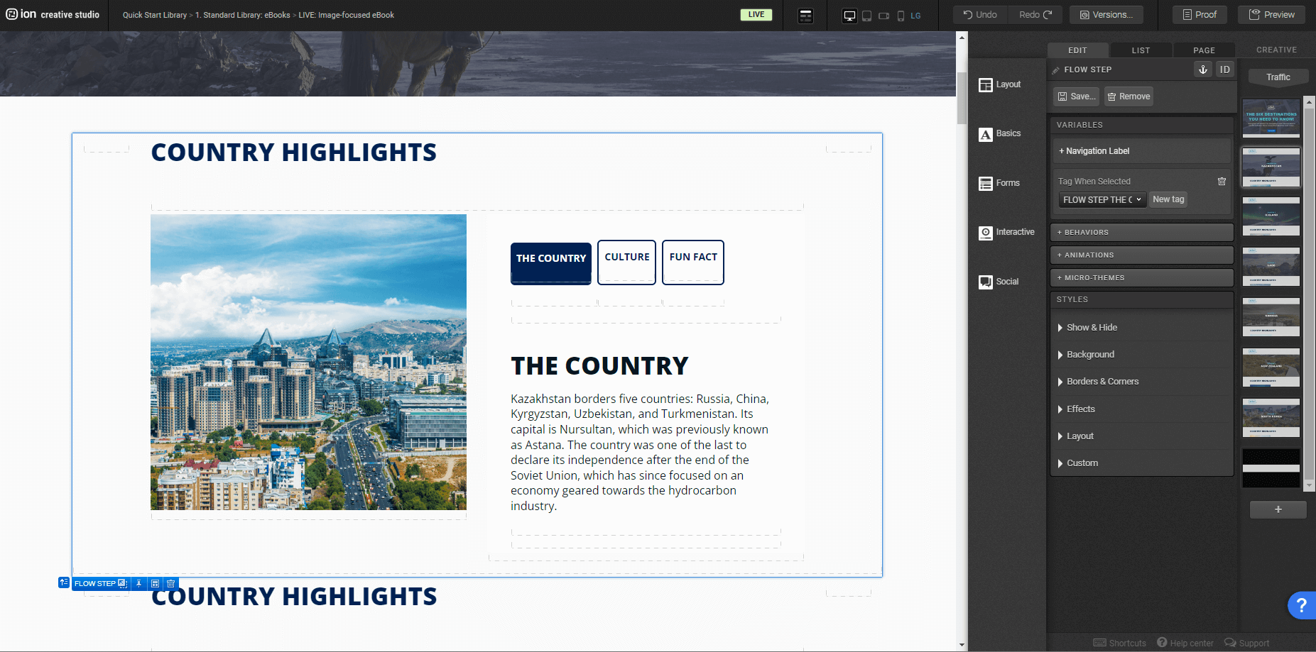 Showcase your six-chapter eBook with exciting images, enticing the user to jump right into their desired topic and navigate through a diverse range of interactive components. This template includes several interactive components such as flows, turning a dense content into an fun exploration experience. Users are encouraged to complete a quiz gathering information of their favorite choice.