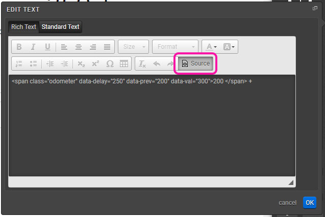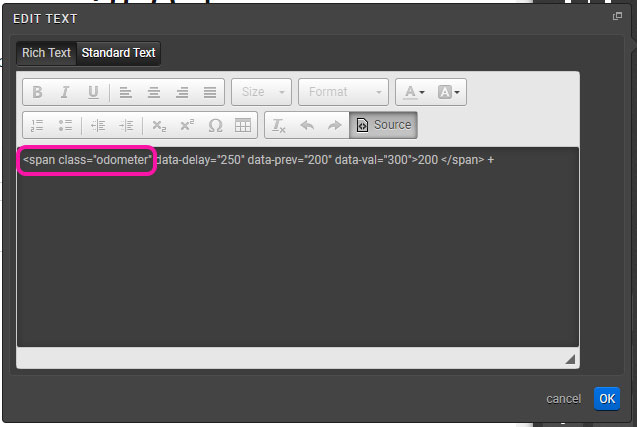 In the Rich Text Editor > Source, add a span tag around the number that you would like to apply the Odometer to: